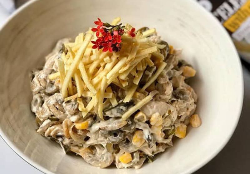 توجه داشته باشید که باید حرارت بالا باشد تا قارچ سرخ شود و آب نریزد. در ادامه، پیاز سرخ شده، مرغ ریش ریش و قارچ سرخ شده را به یک کاسه مناسب اضافه میکنیم. سپس ذرت شیرین را به مخلوط مرغ اضافه میکنیم.