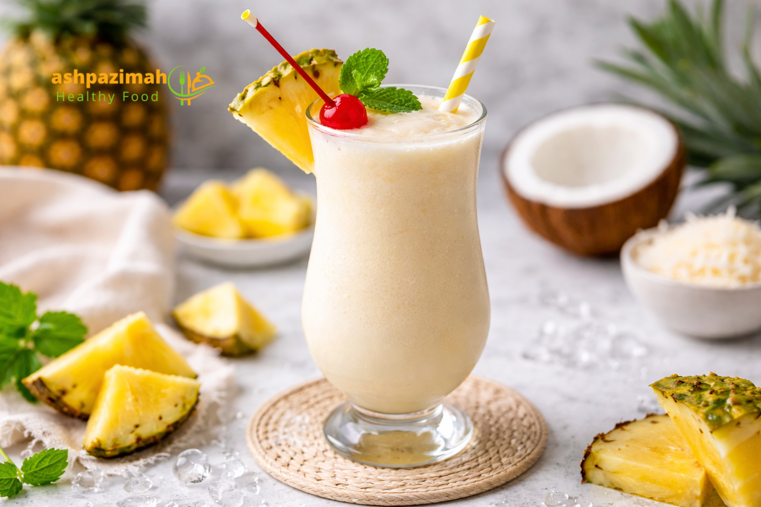 - نسخه سبک: آب آناناس + شیر نارگیل + آناناس یخزده + یخ